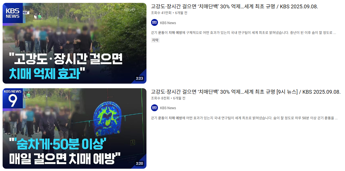 최근 뉴스에서도 숨차게 50분이상 매일 걸으면 치매 억제 효과가 있다는 것이 밝혀졌다고 합니다.